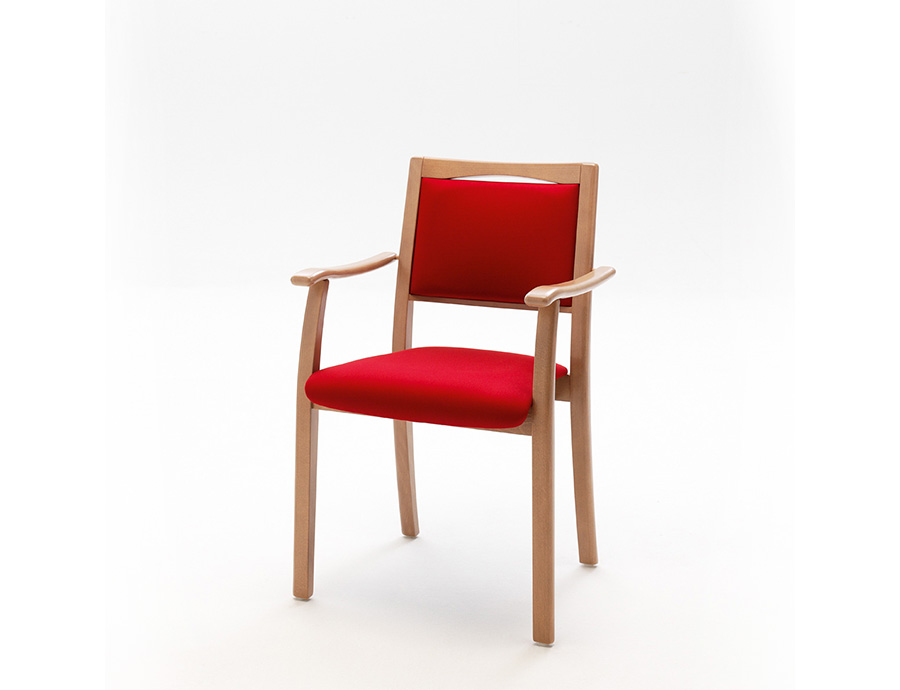 Siège avec accoudoirs et pieds arrondis. Excellent confort grâce au rembourrage de l'assise et du dossier. Armature stable en bois massif verni. Système de siège empilable. Fente dans le dossier servant de poignée.