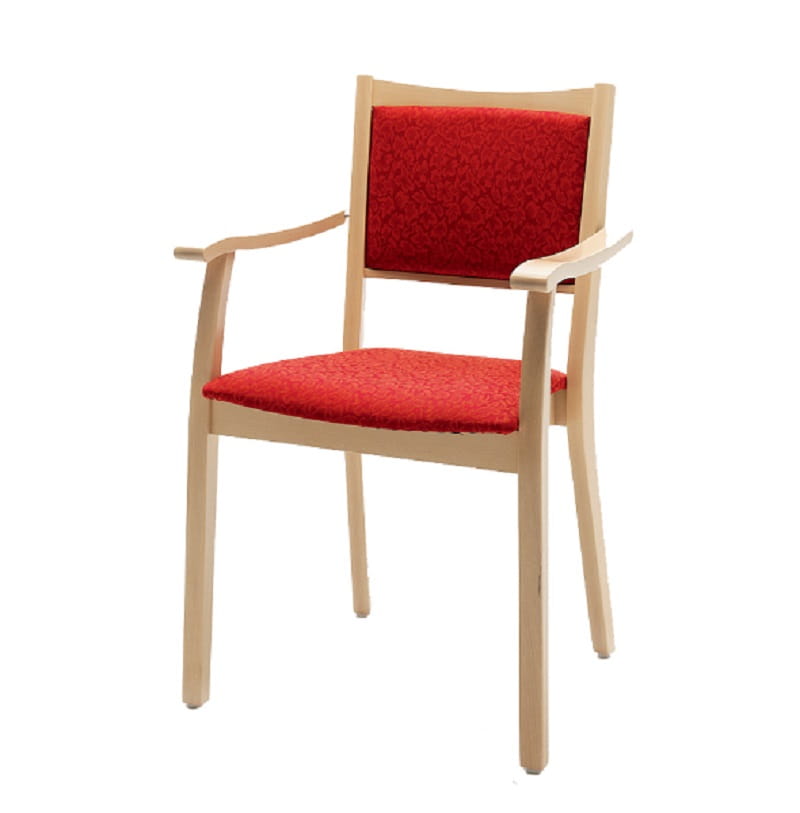 Stoel met armleuning en rechte stollen. Het gestoffeerde zit- en ruggedeelte zorgt voor een hoog zitcomfort. Het stabiele onderstel is van gelakt, massief hout. Bovendien kan de stoel worden gestapeld.